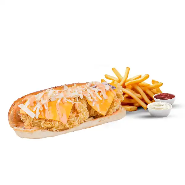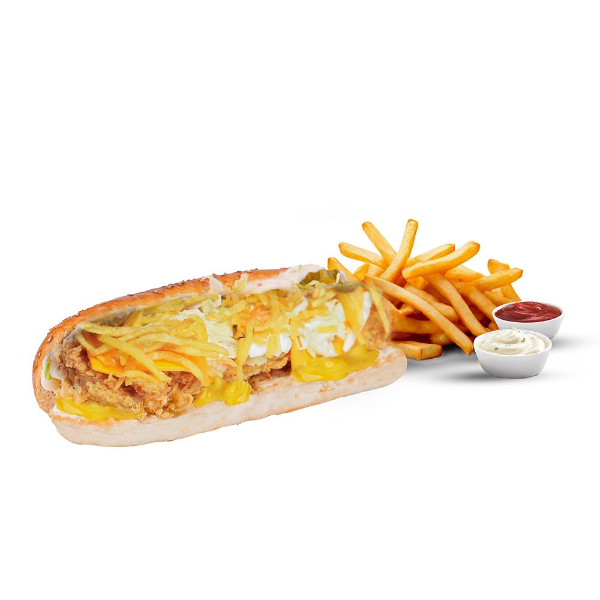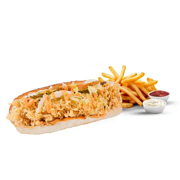 12 SAAT MARİNE EDİLMİŞ 170 - 200 GR ÇITIR TAVUK, SANSAR DEEP SOS, MAYONEZ, CHEDDAR PEYNERİ, ICEBERG, TURŞU, COLESLAW SALATASI VE YANINDA PATATES KIZARTMASI